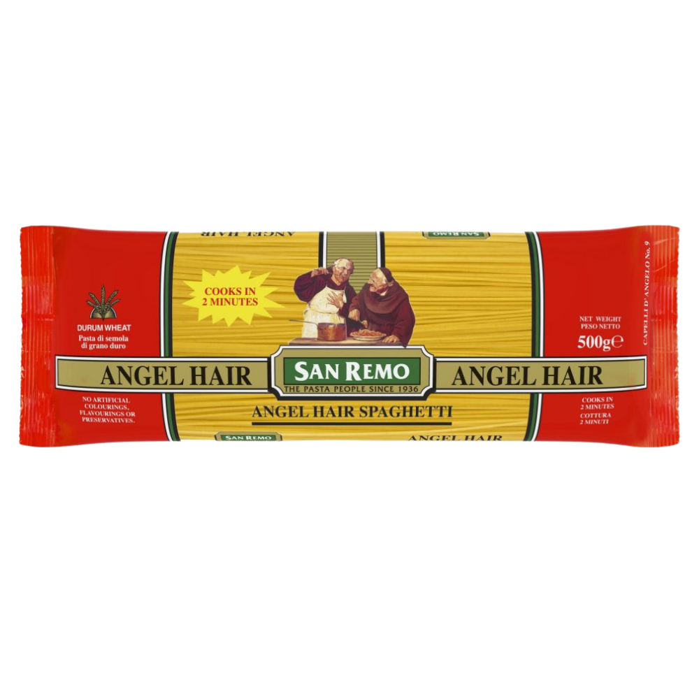 Mì Ý sợi nhỏ Angel Hair số 9 hiệu San Remo 500g là dòng mì pasta cao cấp với thiết kế sợi rất mảnh, nhẹ và thanh, thường được biết đến với tên gọi “tóc thiên thần”. Nhờ đặc điểm sợi cực nhỏ, loại mì này có thời gian nấu nhanh và mang lại cảm giác mềm mại, dễ ăn, phù hợp với nhiều đối tượng sử dụng trong gia đình.
